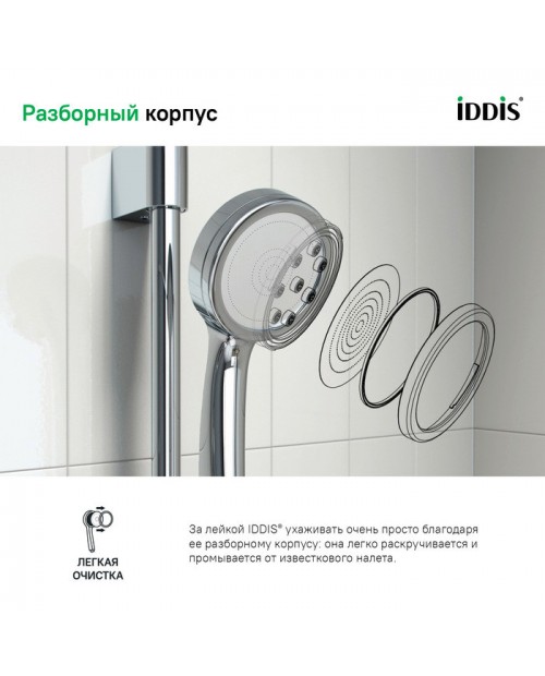 За лейкой IDDIS® ухаживать очень просто благодаря ее разборному корпусу: она легко раскручивается и промывается от известкового налета.