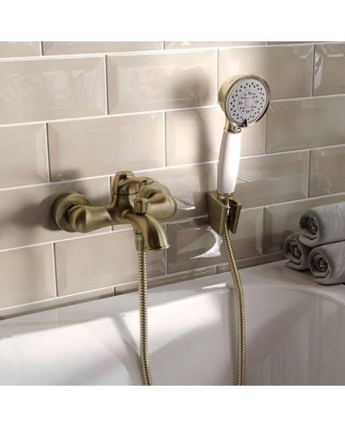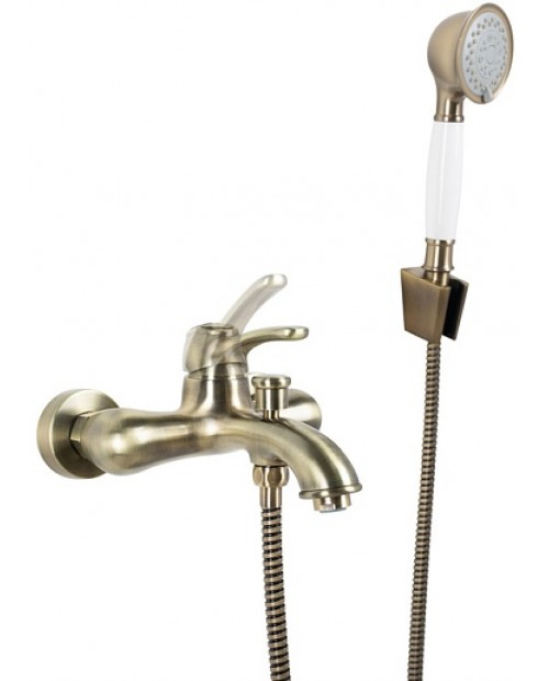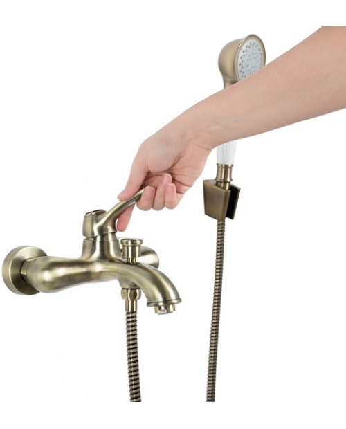 меситель для ванны Oldie – превосходное сочетание утонченной формы и современного функционала в ретро стилистике. Со смесителями из коллекции Oldie легко воплотить в жизнь любые дизайнерские идеи – оригинальные детали белого цвета и благородный бронзовый блеск корпуса легко сочетаются с любыми фактурными поверхностями и интерьерными решениями. Продуманные пропорции, наклон излива и положение аэратора позволяют с комфортом размещать руки под смесителем, что делает его удобным для всей семьи. В комплекте душевые аксессуары в тон смесителю — лейка с держателем и гибкий шланг для душа (1,5 м) в оплетке из нержавеющей стали с защитой от перекручивания.