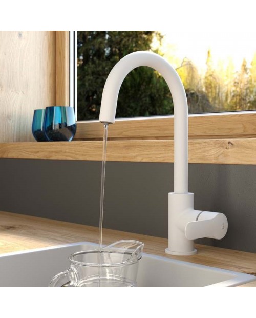 Смеситель для кухни Cuba в трендовом белом матовом цвете с каналом для фильтрованной воды представляет уникальную технологию управления фильтрованной водой, которая практически не имеет аналогов: она включается той же ручкой, что и обычная. Чтобы налить стакан чистой воды, достаточно просто повернуть ручку на себя в закрытом состоянии. Нет необходимости устанавливать отдельный смеситель и сверлить под него отверстие.