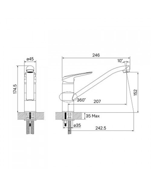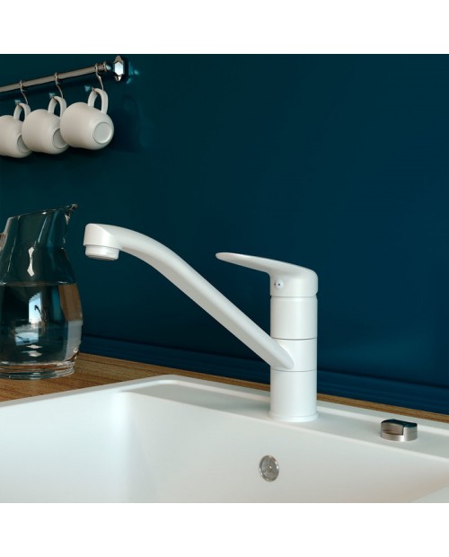 Смеситель для кухни Male привлекает внимание сдержанной плавностью линий и изящным дизайном. Белове матовое покрытие сделает смеситель завершающим акцентом в интерьере современной кухни. Благодаря поворотному изливу пользоваться им удобно на любой кухонной мойке. В комплекте гибкая подводка 40 см из нетоксичной резины, крепеж.