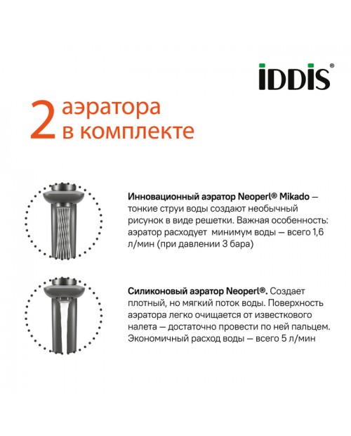 Два технологичных аэратора в комплекте: — Инновационный аэратор Neoperl® Mikado с необычным рисунком воды из-под крана в виде решетки, расходует минимум воды — всего 1,6 л/мин (при давлении 3 бара).