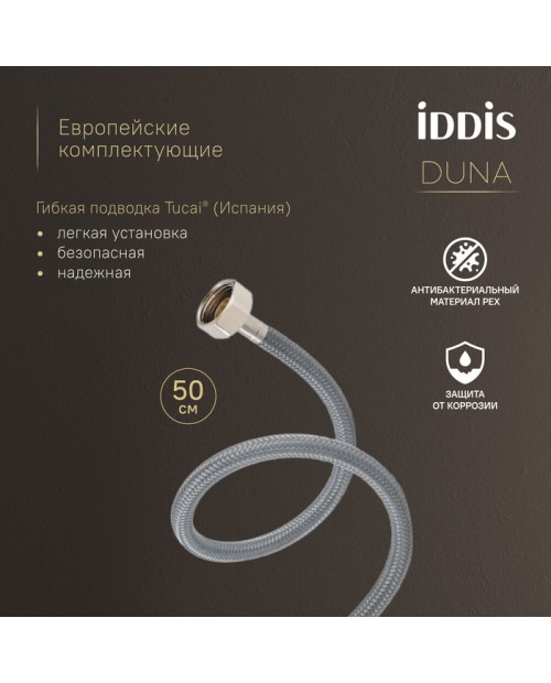 Смеситель для умывальника Duna – воплощение актуальных трендов в дизайне смесителей в безупречном исполнении: фрезеровка, изысканная ручка-петля, модные цвета и фактуры. Ручка выполнена из латуни для сохранения чёткости линий фрезеровки. Европейские комплектующие и технологии — для премиального качества. — Скрытый аэратор Neoperl® (Швейцария) не нарушает дизайн, формирует ровный поток и снижает расход воды. Ключ для обслуживания в комплекте. — Керамический картридж с металлическим штоком Сitec® (Испания) обеспечивает долговечность, точность регулировки и плавный ход ручки. — Гибкая подводка Tucai® (Испания): безопасна для здоровья благодаря шлангу из нетоксичного материала PEX с антибактериальным эффектом, нейлоновая оплетка для защиты от коррозии и износа, увеличенная длина 50 см упрощает монтаж. Простая надёжная установка: металлическая гайка с тремя винтами — стабильность без люфта даже на неровной поверхности. Максимум тишины при работе: благодаря корпусу из нержавеющей стали работает практически бесшумно