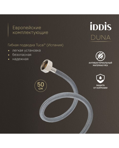 Смеситель для умывальника Duna – воплощение актуальных трендов в дизайне смесителей в безупречном исполнении: фрезеровка, изысканная ручка-петля, модные цвета и фактуры. Ручка выполнена из латуни для сохранения чёткости линий фрезеровки. Европейские комплектующие и технологии — для премиального качества. — Скрытый аэратор Neoperl® (Швейцария) не нарушает дизайн, формирует ровный поток и снижает расход воды. Ключ для обслуживания в комплекте. — Керамический картридж с металлическим штоком Сitec® (Испания) обеспечивает долговечность, точность регулировки и плавный ход ручки. — Гибкая подводка Tucai® (Испания): безопасна для здоровья благодаря шлангу из нетоксичного материала PEX с антибактериальным эффектом, нейлоновая оплетка для защиты от коррозии и износа, увеличенная длина 50 см упрощает монтаж. Простая надёжная установка: металлическая гайка с тремя винтами — стабильность без люфта даже на неровной поверхности. Максимум тишины при работе: благодаря корпусу из нержавеющей стали работает практически бесшумно