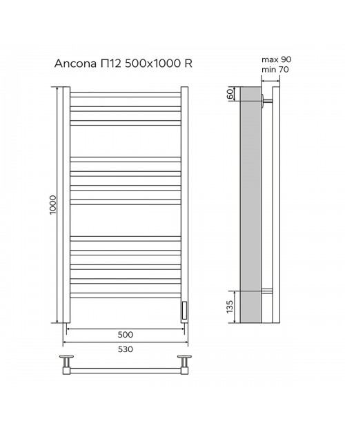 ANCONA 500/1000 Полотенцесушитель электрический квадрат, диммер справа, белый