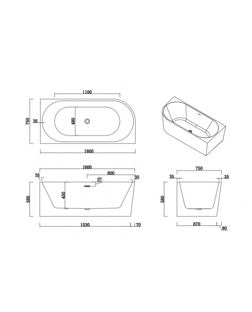 АМОРЕ П Ванна акриловая пристенная 1600*750*580, правая, белый