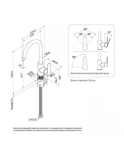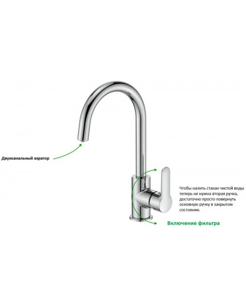 Смеситель для кухни Cuba с каналом для фильтрованной воды представляет уникальную технологию управления фильтрованной водой, которая практически не имеет аналогов: она включается той же ручкой, что и обычная. Чтобы налить стакан чистой воды, достаточно просто повернуть ручку на себя в закрытом состоянии.