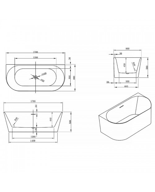 MELADO Ванна акриловая белая, отдельностоящая 1700*800*580