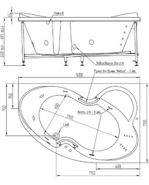 ИНДИГО L Ванна 1680*1100*715 + 2 ручки из нерж. + Слив/перелив "BellSan"